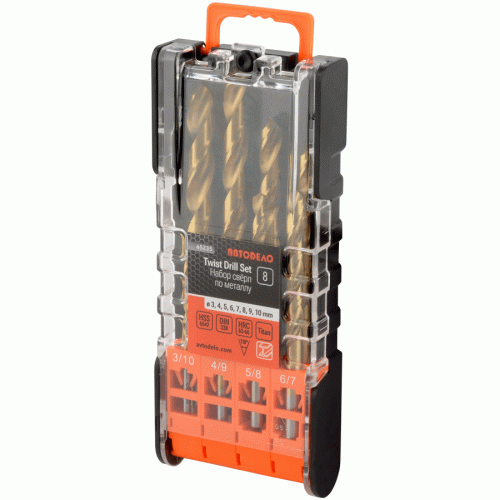 - Наборы состоят из спиральных свёрл с покрытием из нитрида титана (NiTi), с цилиндрическим хвостовиком и крестообразной формой заточки режущей части под углом 118°.