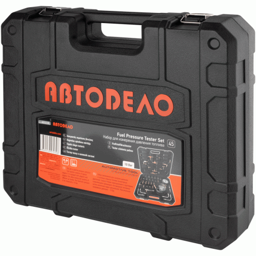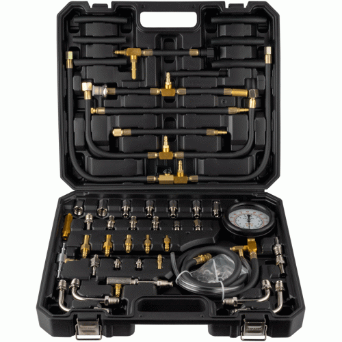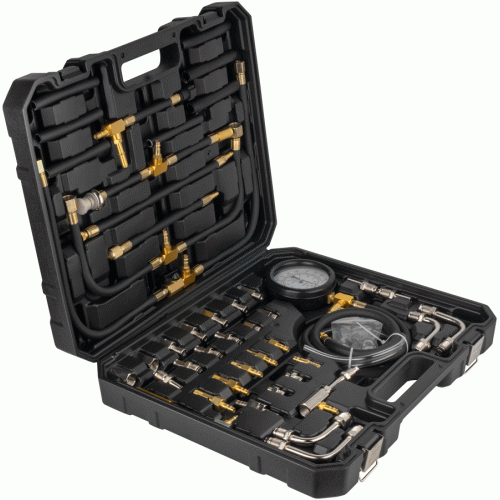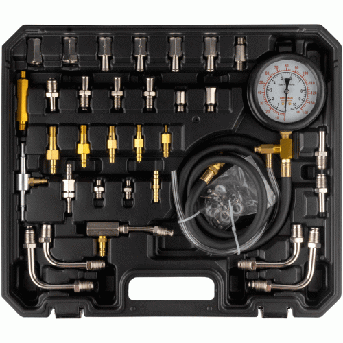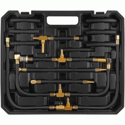 - Укомплектован переходниками и резиновыми шлангами с резьбовыми наконечниками, позволяющими производить тестирование топливных систем различных марок автомобилей.